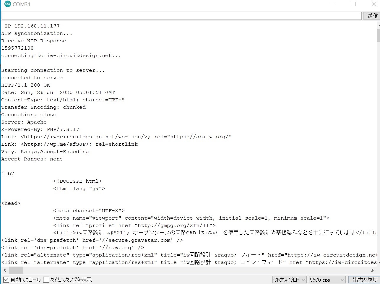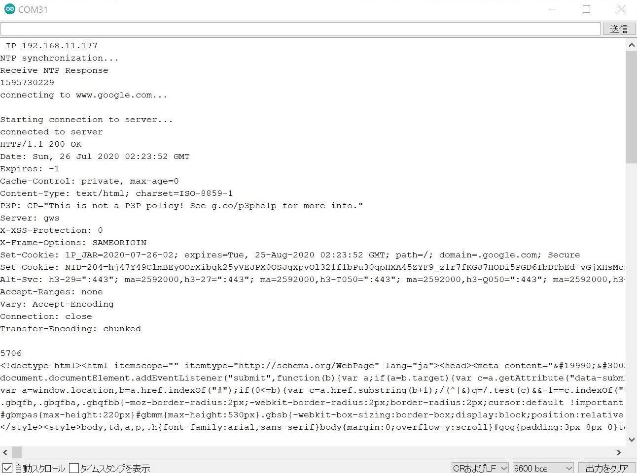 Ethernetライブラリでは現在時刻を取得するAPIは用意されていないので、NTPで現在時刻を取得する処理を追加しました。