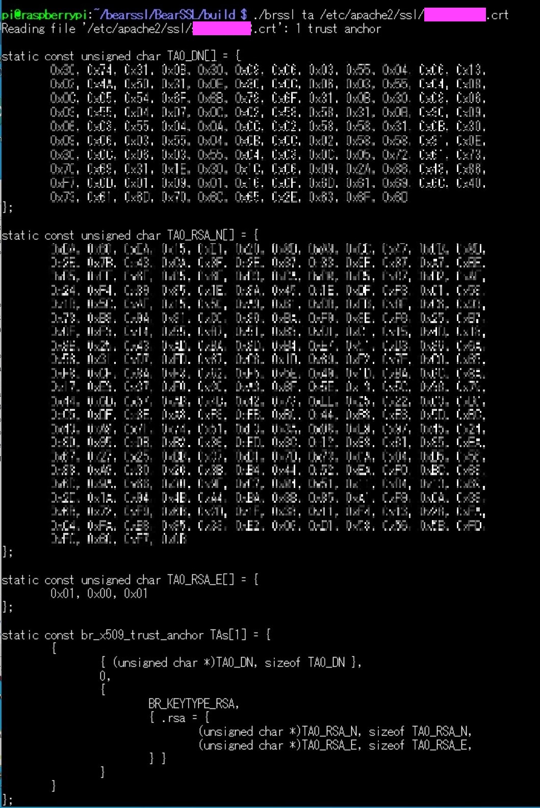./brssl ta 変換したい証明書ファイル - 変換結果が表示されるので、この内容を「BearSSLTrustAnchors.h」に追記する(下記画像は一部モザイク処理をしています)